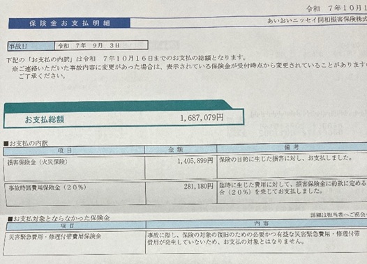 保険申請時のお見積金額より、実際の修繕やリフォームの際のお見積金額が高くなり、保険金受給額で賄う事が出来ない場合がございますので、ご注意ください。